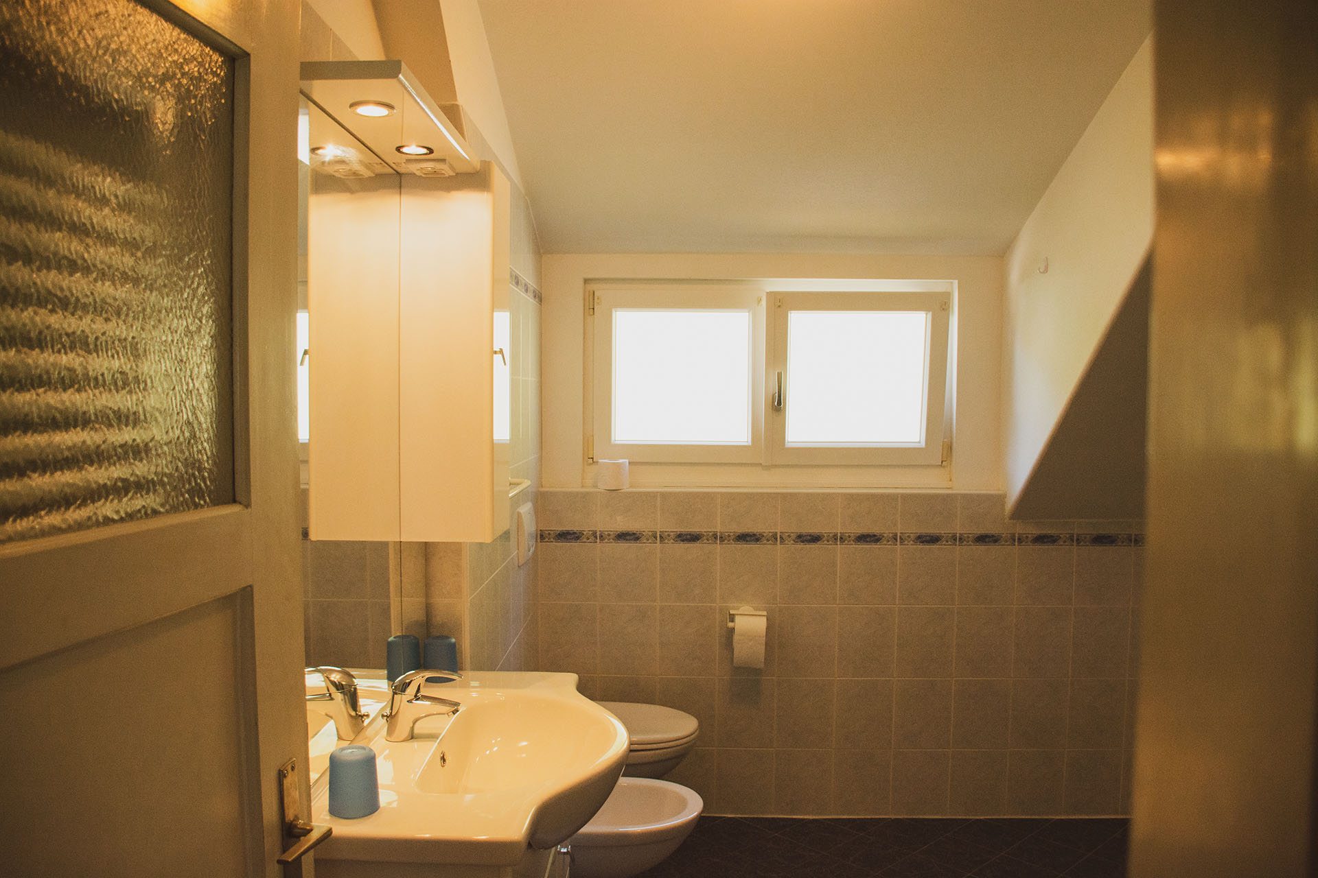 großes Badezimmer mit Dusche, Badewanne, Bidet und Waschmaschine